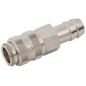 Pneumatic Quick Release, Series 21KS, Safety Lock, Plug, Hose Tail, To Suit Hose Inside Diameter 10mm (3/8"), Non Valved, Brass Nickel Plated, Working Temperature -20°C to +100°C, Maximum Working Pressure 35 bar, Parker Rectus